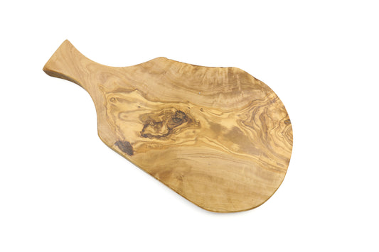 Unregelmäßiges Schneidebrett aus Olivenholz mit Griff, Rinderschenkelform